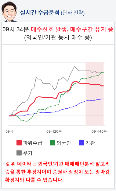 외국인, 기관 수급을 보면 외국인은 매도전환하고 있고, 기관은 매도전환하였다. 알파고는 외국인, 기관의 추가 매도 가능성을 54%로 예상하고 있다.