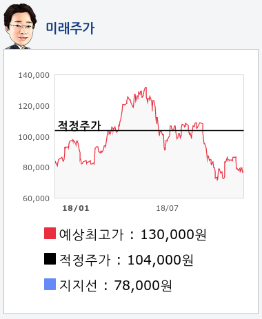 알파고의 재무데이터 분석 결과에 따르면 적정주가는 104,000원을 예상하고 있으며, 목표주가는 130,000원, 지지선은 78,000원 으로 예상하고 있다.