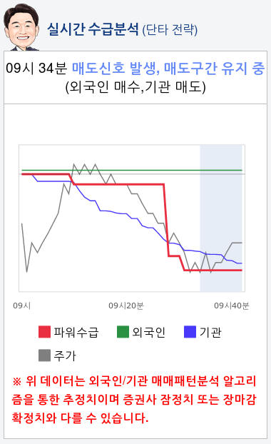 외국인, 기관 수급을 보면 외국인은 매도전환하고 있고, 기관은 매도전환하였다. 알파고는 외국인, 기관의 강한 매도 가능성을 예상하고 있다.