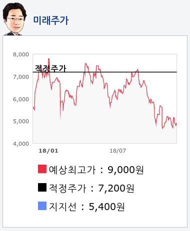 알파고의 재무데이터 분석 결과에 따르면 적정주가는 7,200원을 예상하고 있으며, 목표주가는 9,000원, 지지선은 5,400원 으로 예상하고 있다.