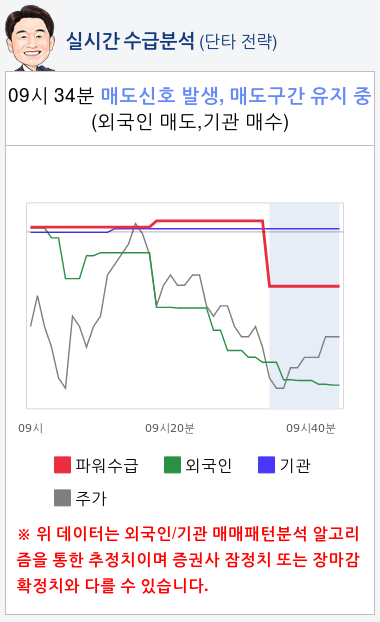 알파고가 분석한 대한광통신 종목의 외국인·기관 당일 실시간 수급은 현재 외국인은 매도하고 있고 기관은 매수하고 있으며, 종합 수급분석 평가지표인 파워수급은 09시 34분 부터 현재까지 매도 에너지가 더 높은 것으로 분석하고 있다.
