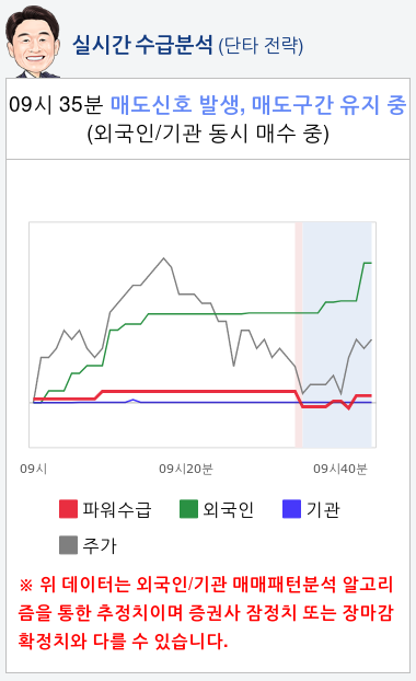 외국인, 기관 수급을 보면 외국인은 3일 연속매수하고 있고, 기관은 매도전환하였다. 알파고는 외국인, 기관의 추가 매수 가능성을 16%로 예상하고 있다.