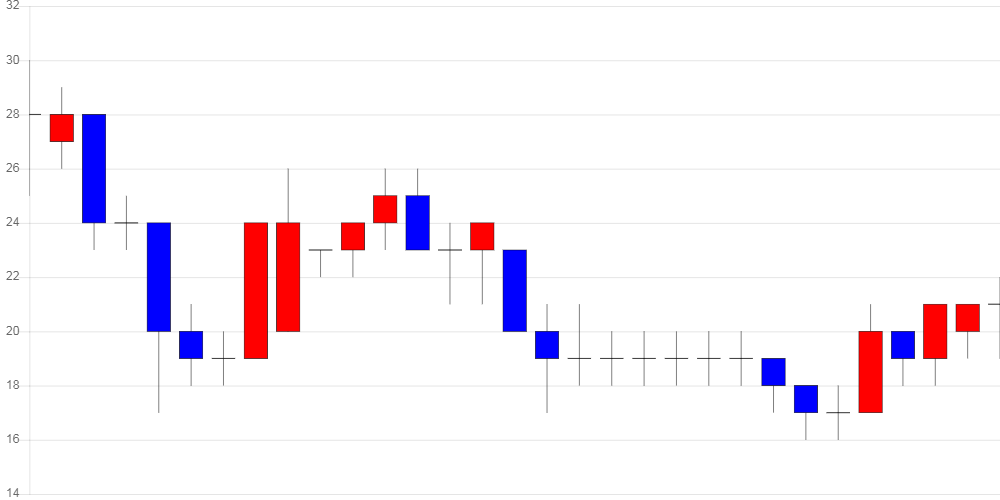 최근 1개월 고점은 30원이었으며, 현재 가격은 고점 대비 70% 수준이다.