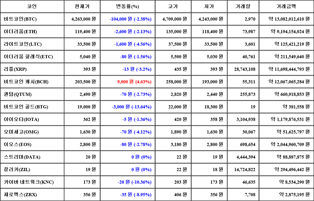 현재 암호화폐 거래소 "코인원"에 따르면 가상화폐 대장 격인 비트코인의 시세는 24시간 전 대비 104,000원(-2.38%) 하락한 4,263,000원에 거래되고 있다.