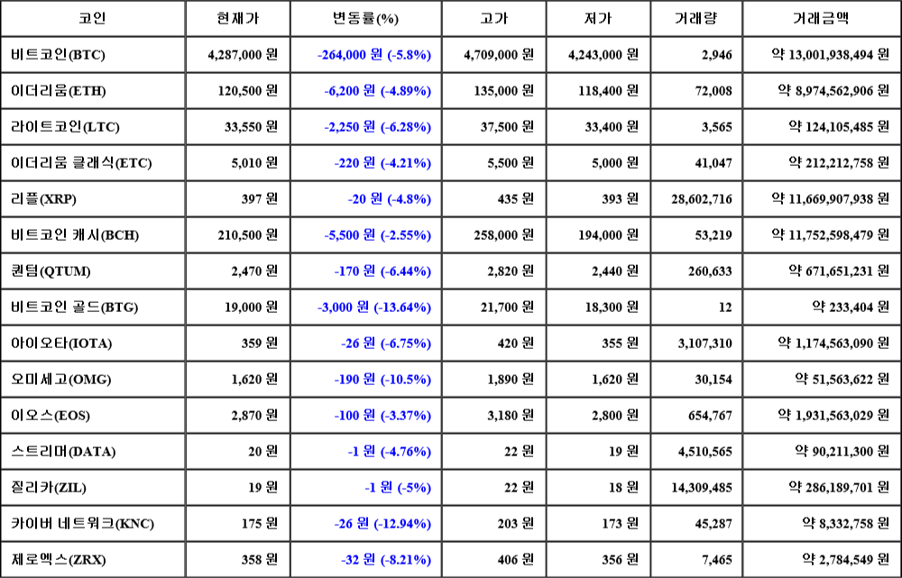 현재 암호화폐 거래소 "코인원"에 따르면 가상화폐 대장 격인 비트코인의 시세는 24시간 전 대비 264,000원(-5.8%) 하락한 4,287,000원에 거래되고 있다.