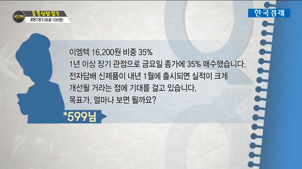 [국고처 최승욱] 종목상담 - 이엠텍(091120)12월 22일 방송된 '국민주식고충처리반'에 출연한 최승욱파트너가 이엠텍(091120)에 대한 시세와 전망을 이야기하고 있다.▶대한민국 대표 증권방송 '국민주식고충처리반' 매주 토 오전 9시스마트폰 앱 '주식창'에 시청자 의견 남겨주세요.