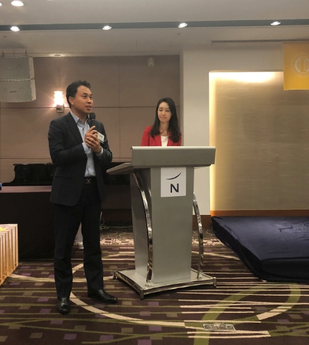 <사진: 한국경제TV 한국외대 베트남 비즈 최고위과정 제2기 수료식에서 제1기 원우회를 대표해 격려사를 하고 있는 정성훈 매일유업 CFO. 오른쪽은 제2기 수료식 사회를 맡은 이주비 부동산부 기자 / 정성훈 CFO는 앞서 제1기 과정을 수료한 뒤, 현재 원우회 회장 대행을 맡고 있다. 제3기 최고위과정은 내년(2019년) 3월초 시작된다.>
