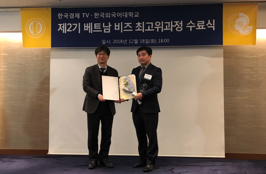 <사진: 왼쪽은 김종석 한국외대 부총장, 오른쪽은 한국경제TV 한국외대 베트남 비즈 최고위과정 제2기 수료식에서 수료증서와 상패를 받은 한동섭 (주)모트렉스 이사>