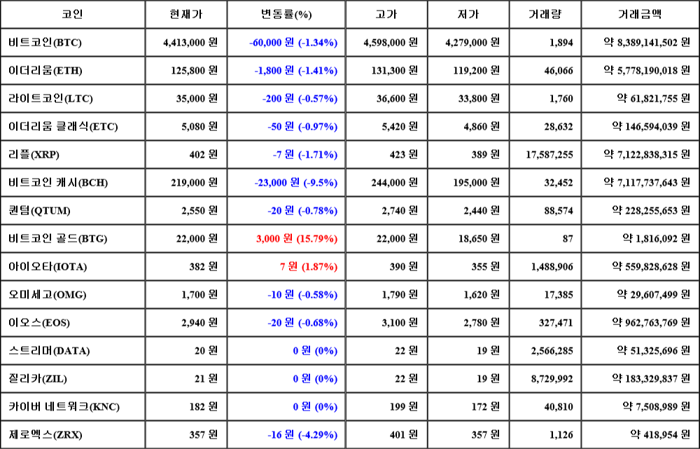 또한, 제로엑스(-4.29%, 357원), 리플(-1.71%, 402원), 이더리움(-1.41%, 125,800원), 이더리움 클래식(-0.97%, 5,080원), 퀀텀(-0.78%, 2,550원), 이오스(-0.68%, 2,940원), 오미세고(-0.58%, 1,700원), 라이트코인(-0.57%, 35,000원)은 하락세를 나타냈다.