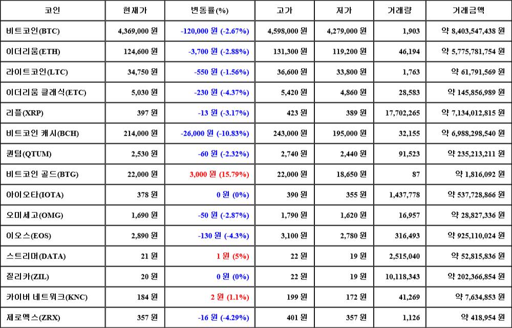 또한, 이더리움 클래식(-4.37%, 5,030원), 이오스(-4.3%, 2,890원), 제로엑스(-4.29%, 357원), 리플(-3.17%, 397원), 이더리움(-2.88%, 124,600원), 오미세고(-2.87%, 1,690원), 퀀텀(-2.32%, 2,530원), 라이트코인(-1.56%, 34,750원)은 하락세를 나타냈다.