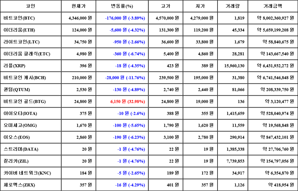 현재 암호화폐 거래소 "코인원"에 따르면 가상화폐 대장 격인 비트코인의 시세는 24시간 전 대비 176,000원(-3.89%) 하락한 4,346,000원에 거래되고 있다.
