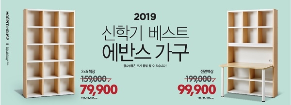 신혼 서재로도 활용도가 높은 모던하우스의 에반스 시리즈는 1월 말까지 5000조 한정 15만9000원의 3*5 책장을 7만9900원에, 19만9000원의 전면책상 상품을 9만9900원에 한정판으로 판매할 예정이다. 제품 품절 시 행사 조기마감 될 수 있다.