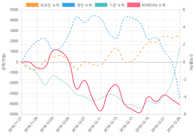[그림 1] 최근 한달간 투자자별 매매동향 및 코스닥 수익률