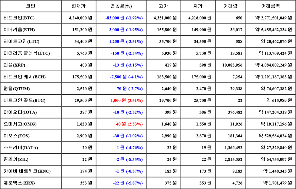 현재 암호화폐 거래소 "코인원"에 따르면 가상화폐 대장 격인 비트코인의 시세는 24시간 전 대비 83,000원(-1.92%) 하락한 4,240,000원에 거래되고 있다.