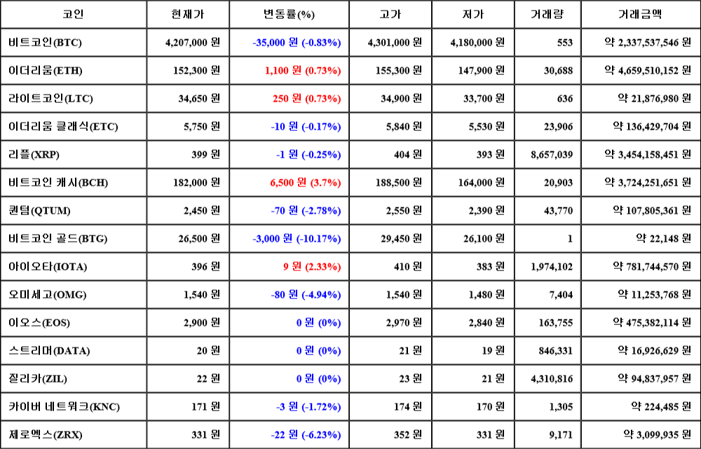 현재 암호화폐 거래소 "코인원"에 따르면 가상화폐 대장 격인 비트코인의 시세는 24시간 전 대비 35,000원(-0.83%) 하락한 4,207,000원에 거래되고 있다.