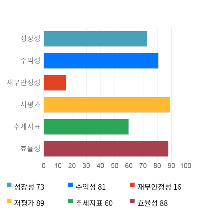주가 모멘텀은 평범한 수준이었다. 최근 1개월 수익률이 0.98%, 3개월 수익률은 -6.35%, 6개월 수익률은 -4.62%를 기록했다.