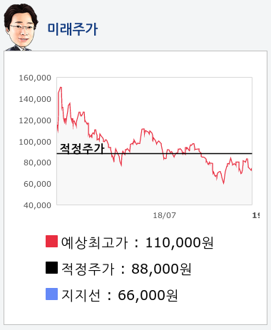 알파고의 재무데이터 분석 결과에 따르면 적정주가는 88,000원을 예상하고 있으며, 목표주가는 110,000원, 지지선은 66,000원 으로 예상하고 있다.
