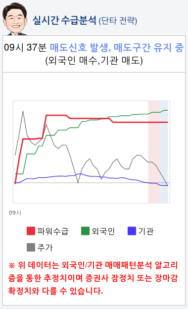 외국인, 기관 수급을 보면 외국인은 매도전환하고 있고, 기관은 매수전환하였다. 알파고는 외국인, 기관의 추가 매수 가능성을 50%로 예상하고 있다.