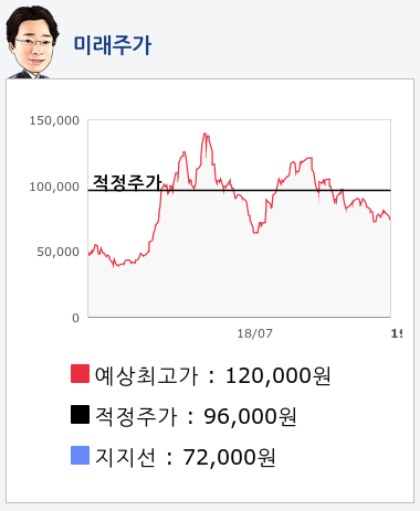 알파고의 재무데이터 분석 결과에 따르면 적정주가는 96,000원을 예상하고 있으며, 목표주가는 120,000원, 지지선은 72,000원 으로 예상하고 있다.