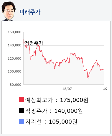 알파고의 재무데이터 분석 결과에 따르면 적정주가는 140,000원을 예상하고 있으며, 목표주가는 175,000원, 지지선은 105,000원 으로 예상하고 있다.