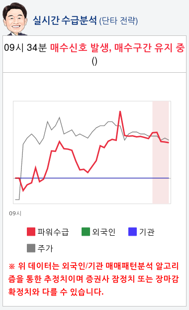 외국인, 기관 수급을 보면 외국인은 2일 연속 매도하고 있고, 기관은 매수전환하였다. 알파고는 외국인, 기관의 추가 매수 가능성을 18%로 예상하고 있다.