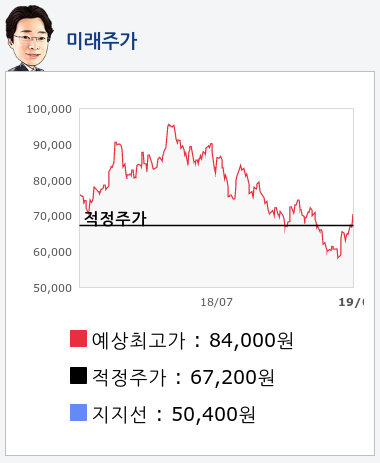 알파고의 재무데이터 분석 결과에 따르면 적정주가는 67,200원을 예상하고 있으며, 목표주가는 84,000원, 지지선은 50,400원 으로 예상하고 있다.
