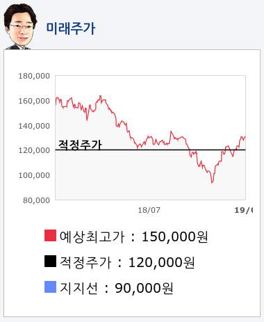 알파고의 재무데이터 분석 결과에 따르면 적정주가는 120,000원을 예상하고 있으며, 목표주가는 150,000원, 지지선은 90,000원 으로 예상하고 있다.