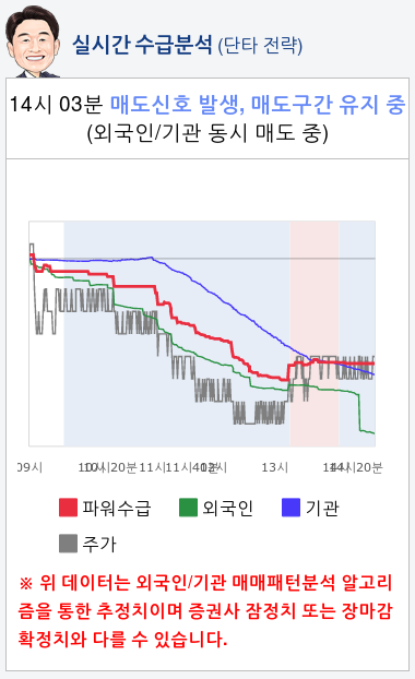 외국인, 기관 수급을 보면 외국인은 매도전환하고 있고, 기관은 매수전환하였다. 알파고는 외국인, 기관의 추가 매수 가능성을 18%로 예상하고 있다.