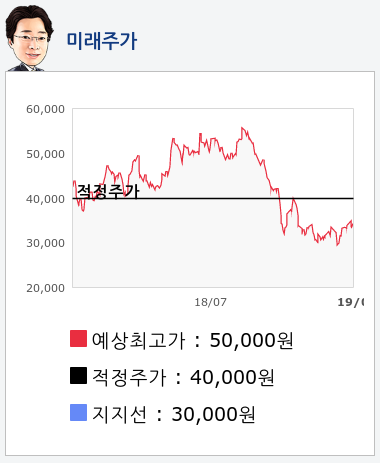 알파고의 재무데이터 분석 결과에 따르면 적정주가는 40,000원을 예상하고 있으며, 목표주가는 50,000원, 지지선은 30,000원 으로 예상하고 있다.