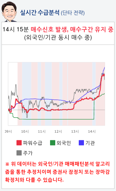 외국인, 기관 수급을 보면 외국인은 매수전환하고 있고, 기관은 2일 연속 매수하였다. 알파고는 외국인, 기관의 추가 매수 가능성을 80%로 예상하고 있다.