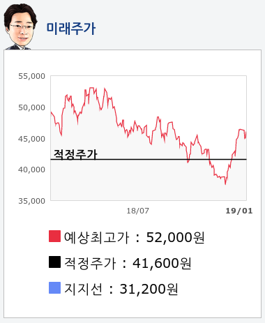 알파고의 재무데이터 분석 결과에 따르면 적정주가는 41,600원을 예상하고 있으며, 목표주가는 52,000원, 지지선은 31,200원 으로 예상하고 있다.