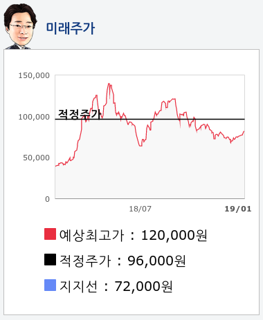 알파고의 재무데이터 분석 결과에 따르면 적정주가는 96,000원을 예상하고 있으며, 목표주가는 120,000원, 지지선은 72,000원 으로 예상하고 있다.