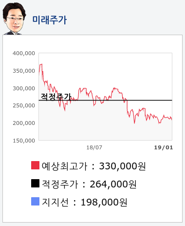 알파고의 재무데이터 분석 결과에 따르면 적정주가는 264,000원을 예상하고 있으며, 목표주가는 330,000원, 지지선은 198,000원 으로 예상하고 있다.
