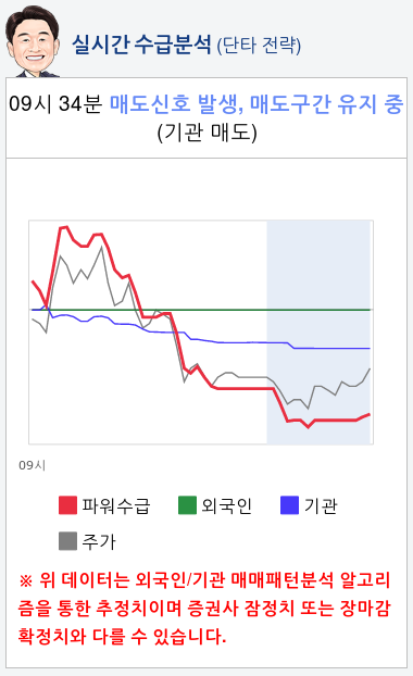 외국인, 기관 수급을 보면 외국인은 4일 연속매수하고 있고, 기관은 2일 연속 매수하였다. 알파고는 외국인, 기관의 추가 매수 가능성을 88%로 예상하고 있다.