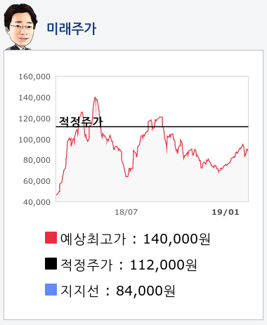 알파고의 재무데이터 분석 결과에 따르면 적정주가는 112,000원을 예상하고 있으며, 목표주가는 140,000원, 지지선은 84,000원 으로 예상하고 있다.