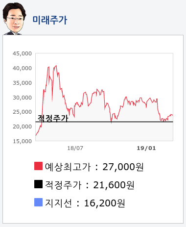 알파고의 재무데이터 분석 결과에 따르면 적정주가는 21,600원을 예상하고 있으며, 목표주가는 27,000원, 지지선은 16,200원 으로 예상하고 있다.