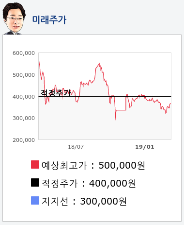 알파고의 재무데이터 분석 결과에 따르면 적정주가는 400,000원을 예상하고 있으며, 목표주가는 500,000원, 지지선은 300,000원 으로 예상하고 있다.