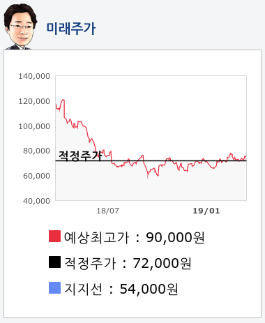 알파고의 재무데이터 분석 결과에 따르면 적정주가는 72,000원을 예상하고 있으며, 목표주가는 90,000원, 지지선은 54,000원 으로 예상하고 있다.