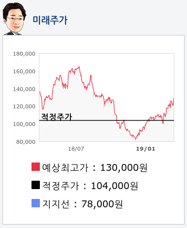 알파고의 재무데이터 분석 결과에 따르면 적정주가는 104,000원을 예상하고 있으며, 목표주가는 130,000원, 지지선은 78,000원 으로 예상하고 있다.