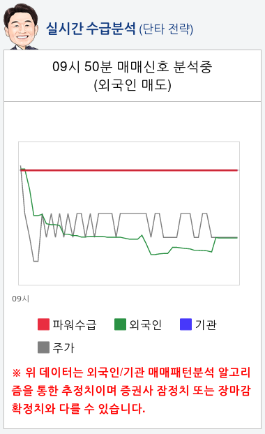 외국인, 기관 수급을 보면 외국인은 4일 연속매수하고 있고, 기관은 매수전환하였다. 알파고는 외국인, 기관의 추가 매수 가능성을 80%로 예상하고 있다.