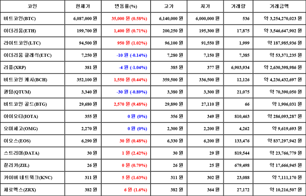 현재 암호화폐 거래소 "코인원"에 따르면 가상화폐 대장 격인 비트코인의 시세는 24시간 전 대비 35,000원(0.58%) 상승한 6,087,000원에 거래되고 있다.