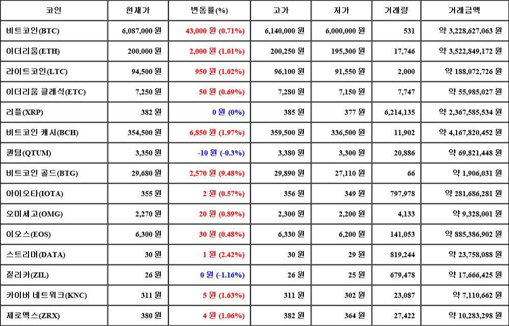 현재 암호화폐 거래소 "코인원"에 따르면 가상화폐 대장 격인 비트코인의 시세는 24시간 전 대비 43,000원(0.71%) 상승한 6,087,000원에 거래되고 있다.