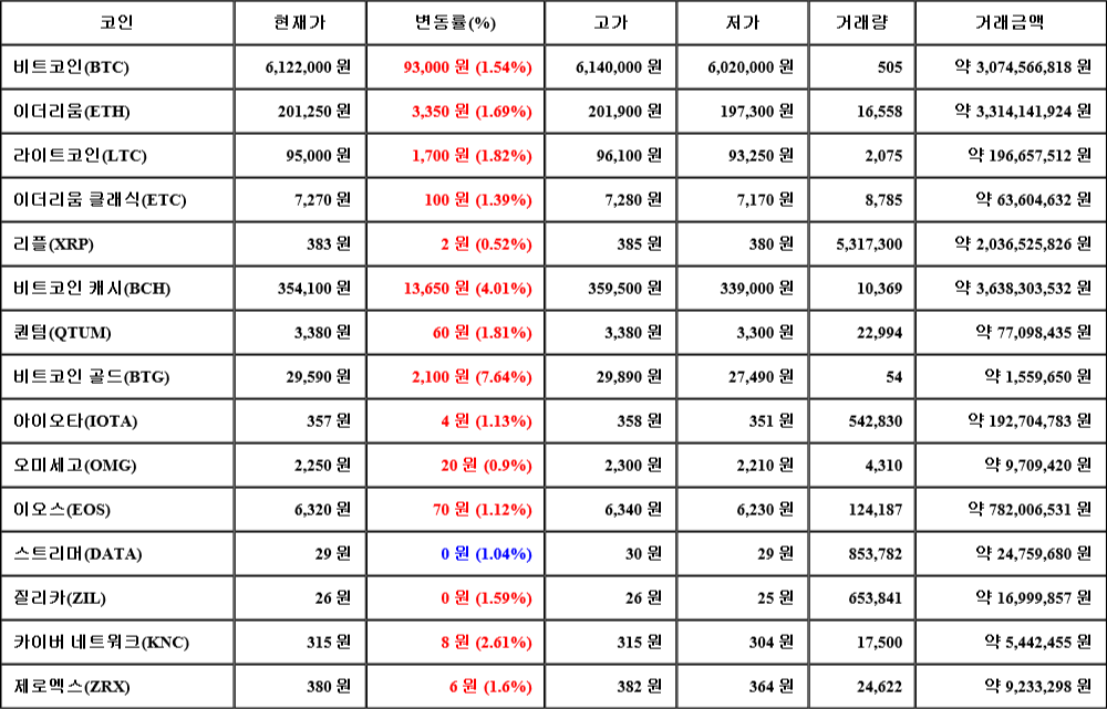 현재 암호화폐 거래소 "코인원"에 따르면 가상화폐 대장 격인 비트코인의 시세는 24시간 전 대비 93,000원(1.54%) 상승한 6,122,000원에 거래되고 있다.