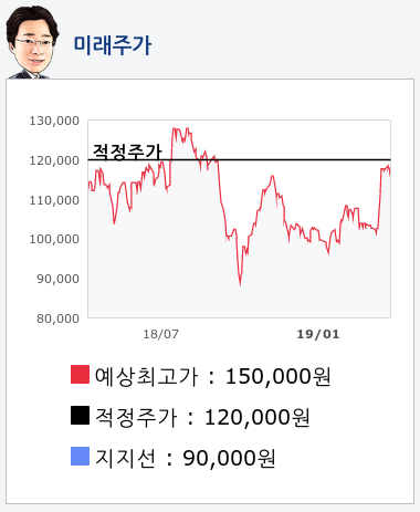 알파고의 재무데이터 분석 결과에 따르면 적정주가는 120,000원을 예상하고 있으며, 목표주가는 150,000원, 지지선은 90,000원 으로 예상하고 있다.