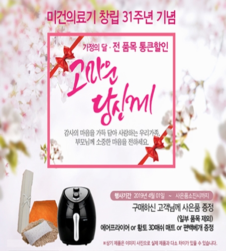 미건의료기(대표 이재화)는 창립 31주년을 기념하고, 다가오는 가정의 달을 맞이해 통 큰 가격 할인 이벤트와 사은행사를 준비했다고 밝혔다.
