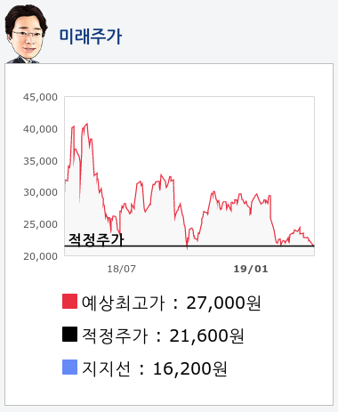 알파고의 재무데이터 분석 결과에 따르면 적정주가는 21,600원을 예상하고 있으며, 목표주가는 27,000원, 지지선은 16,200원 으로 예상하고 있다.
