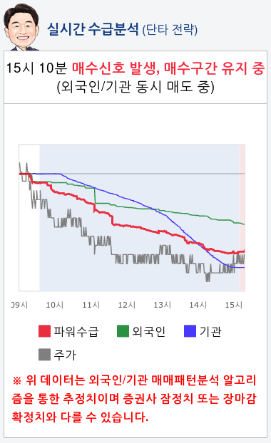 외국인, 기관 수급을 보면 외국인은 2일 연속 매도하고 있고, 기관은 10일 연속 매도하였다. 알파고는 외국인, 기관의 강한 매도 가능성을 예상하고 있다.