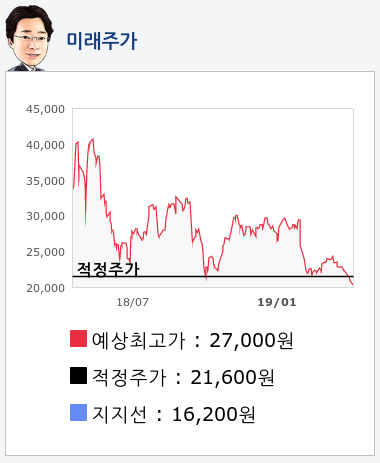 알파고의 재무데이터 분석 결과에 따르면 적정주가는 21,600원을 예상하고 있으며, 목표주가는 27,000원, 지지선은 16,200원 으로 예상하고 있다.