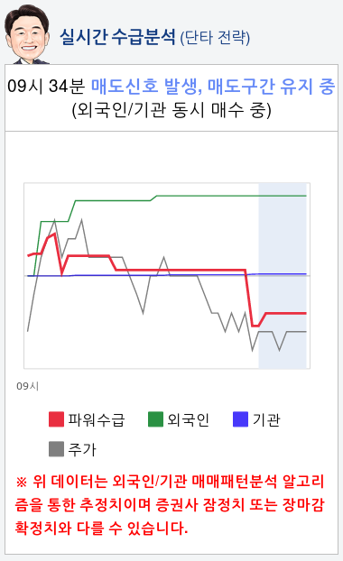 외국인, 기관 수급을 보면 외국인은 2일 연속매수하고 있고, 기관은 12일 연속 매도하였다. 알파고는 외국인, 기관의 추가 매도 가능성을 4%로 예상하고 있다.