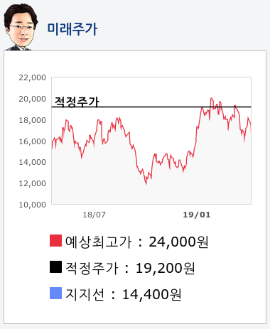 알파고의 재무데이터 분석 결과에 따르면 적정주가는 19,200원을 예상하고 있으며, 목표주가는 24,000원, 지지선은 14,400원 으로 예상하고 있다.
